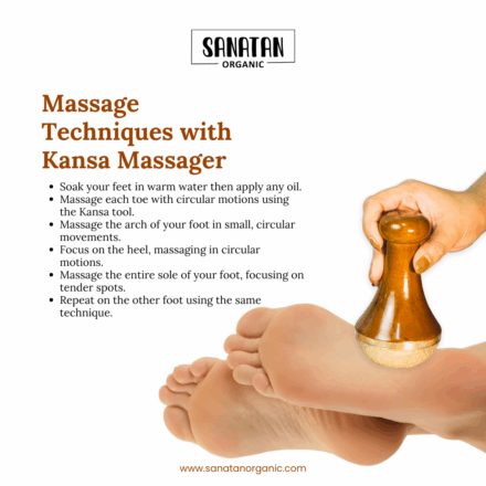 To allow the Kansa Foot Wand to glide smoothly over your skin, apply a small amount of natural foot or massage oil to your feet and legs. Oils like coconut oil, jojoba oil, or sesame oil work well for this purpose, providing additional hydration and nourishment to the skin.